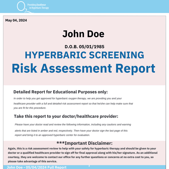 Free Hyperbaric AssessmentTake our medical assessment to see if you are a good candidate for oxygen therapy. Reviewed by our hyperbaric doctor!